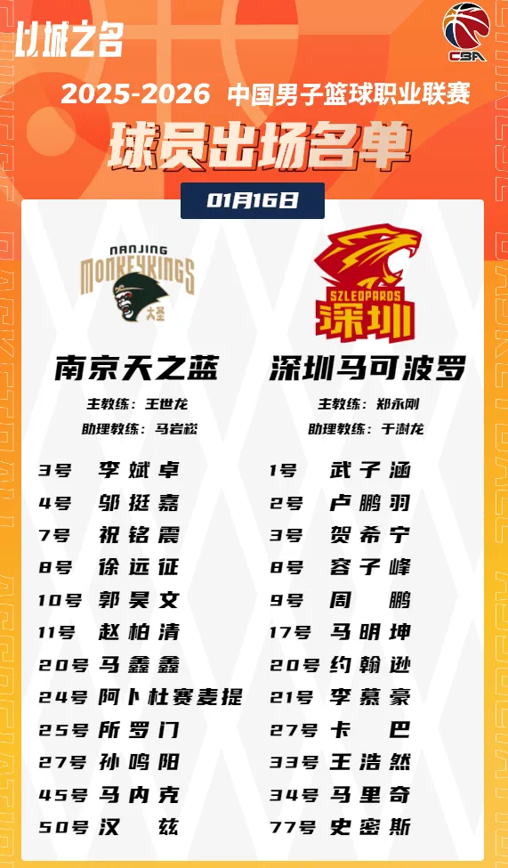 虎扑01月16日讯,今晚CBA常规赛,南京对阵深圳的大名单已经公布。